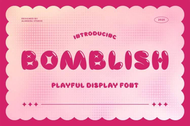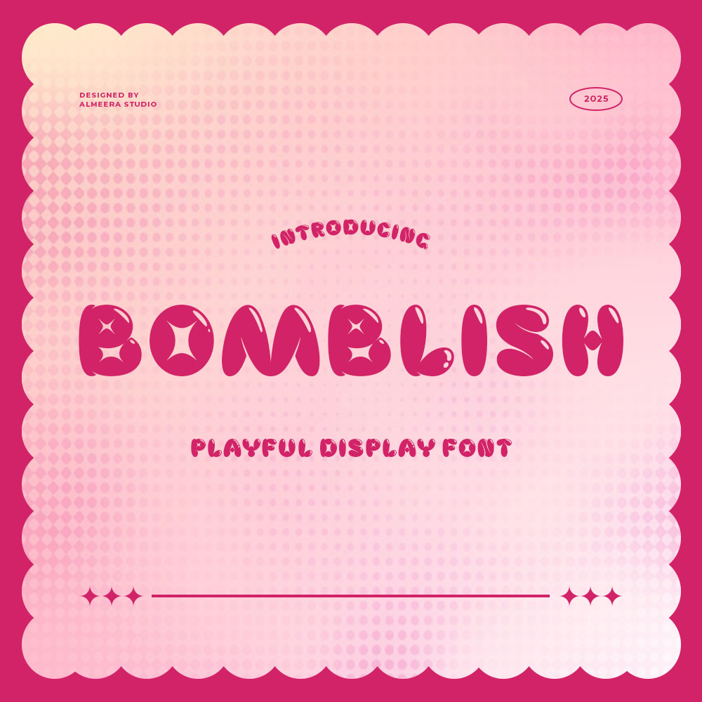 Bomblish is a cheerful and energetic display font. Designed with rounded shapes and a bold personality, this font is perfect for children’s books, comic titles, packaging, posters, and cheerful branding. Its unique style makes designs more cheerful and friendly while remaining easy to read. Ideal for projects that need a touch of fun and creativity.