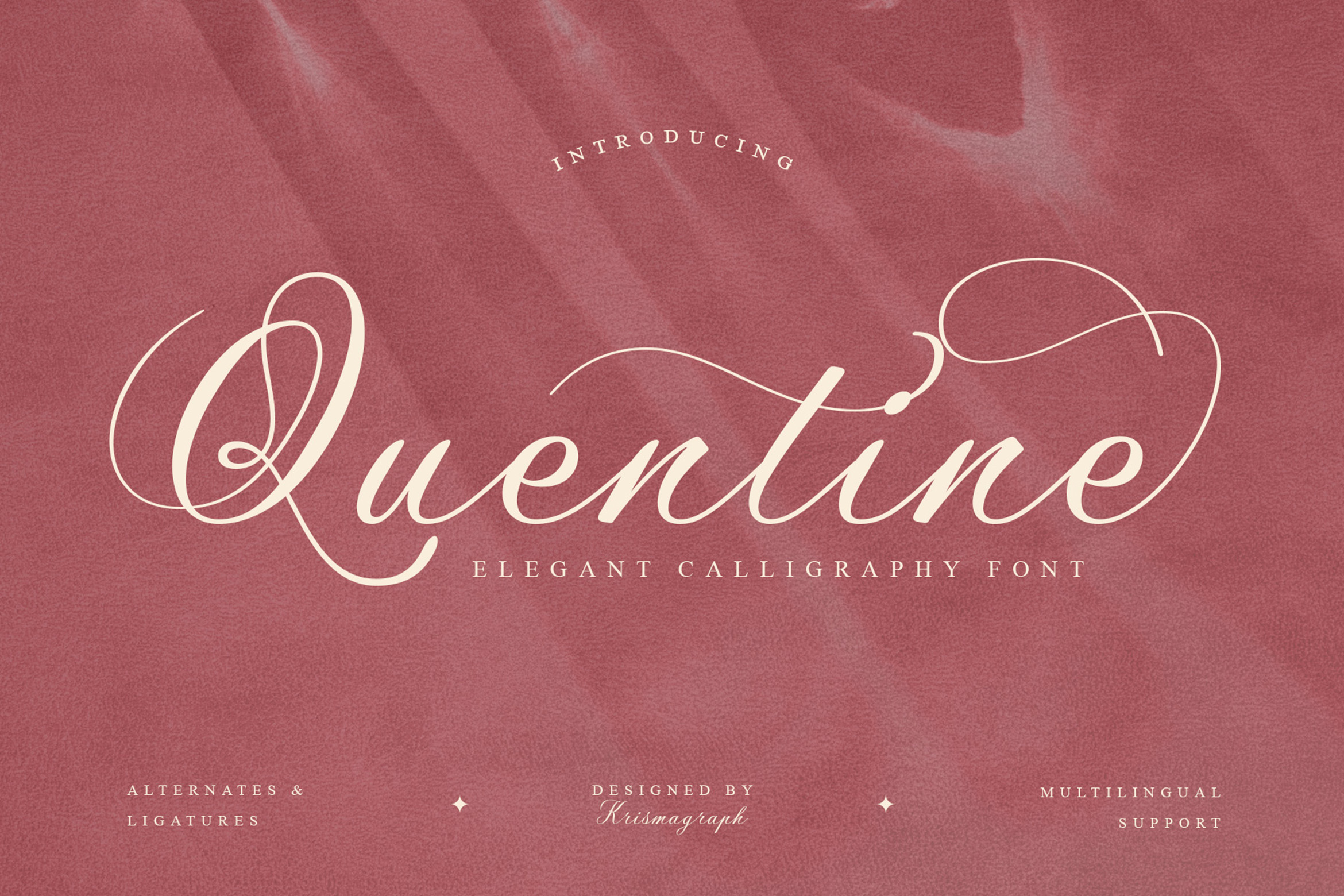 Quentine is an elegant calligraphy font that captures the grace of timeless handwriting. Designed with refined strokes and delicate swashes, this typeface exudes romance, sophistication, and charm — perfect for wedding stationery, invitations, editorial headlines, and luxury branding projects. Its smooth curves and exquisite ligatures create a harmonious balance between beauty and readability.